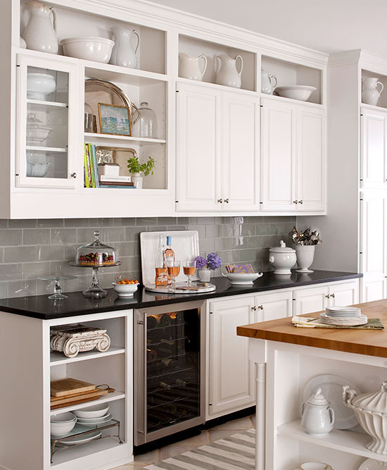 ترکیب کابینت های سنتی باز و بسته از ویژگی های بارز این آشپزخانه می باشند. همانطور که در تصویر بالا مشاهده می کنید کابینت سفید این آشپزخانه سنتی به صورت قفسه های باز و بسته طراحی شده است. رنگ سفید کابینت سنتی در دکوراسیون داخلی این آشپزخانه باعث ایجاد درخشندگی، افزایش نور، آرامش و نشان دهنده ی تمیزی و پاکی شده است. طراح برای اینکه کمی از سردی و بی روحی محیط بکاهد، کانتر مشکی را برای کابینت های سنتی چوبی انتخاب کرده است زیرا صفحات کابینت مشکی با کابینت های سفید در تضاد بوده و با ایجاد یک کنتراست جذاب و چشمگیر بر زیبایی کابینت های سنتی افزوده است.